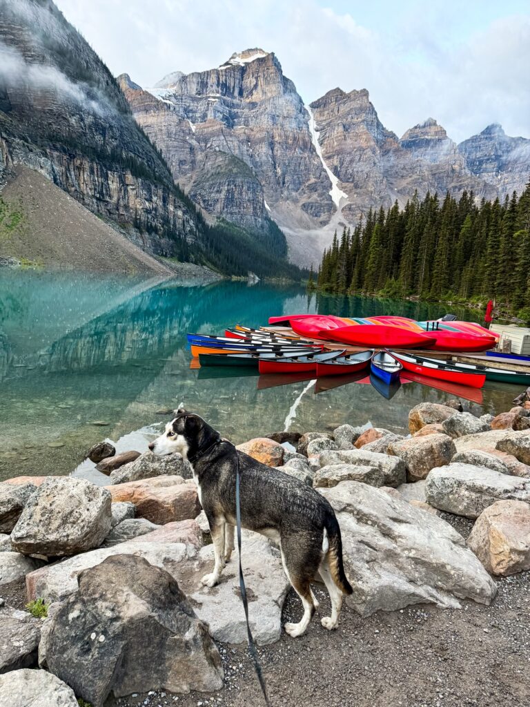 Banff is Canada’s first National Park, established in 1885. It is also the most visited park in Canada. The two most famous lakes in Banff are Moraine Lake and Lake Luis. Both are dog-friendly, except for the kayak rentals. Moraine Lake is only accessible via shuttle bus and there is one company, Fairview Limousine, that offers a dog-friendly shuttle. Lake Luis is accessible by car, but the parking lot fills up very early, like by 6:00 AM, so most people opt to take a shuttle bus here as well. Banff National Park is also well known for the town of Banff, with its many walkable restaurants and shops. I found the town of Banff to also be extremely dog-friendly. There were water bowls outside many of the shops and restaurants for dogs and Max was allowed in every store we went into, as well as inside Nourish, where we had lunch. While hiking in Banff, we primarily visited lakes. See my blog post “7 Dog-Friendly Lakes in Banff National Park” for all the details. You can also check out “Why Your Dog Will Love Banff National Park” for more information about the park.