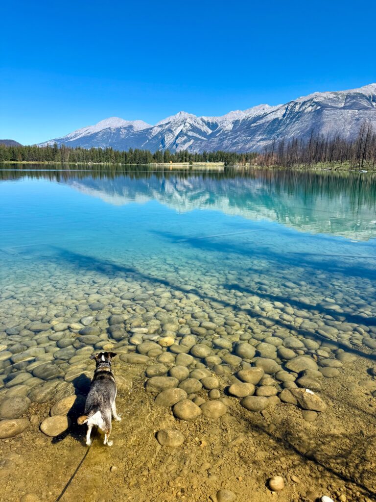 Jasper National Park is the largest of these three parks. With it being more spread out, it feels less crowded. We never had an issue with parking and the trails never felt crowded. Jasper has many lakes that are used for recreational activities, and it felt like a lot of the crowds were on the lakes and lakeshores, leaving the trails less crowded. Jasper National Park is famous for the Icefields Parkway, Athabasca Glacier, and Maligne Lake. In July of 2024, multiple wildfires broke out across Jasper National Park and on many hiking trails you can see the devastation it caused, as well as the new growth beginning on the forest floor. We hiked to three waterfalls and seven lakes in Jasper. For more information, check out my blog posts. I did visit the small town of Jasper, which has some restaurants and shops, although nothing like Banff. Because Banff was so dog-friendly and Max was greeted with such kindness and hospitality, I was disappointed to find that Jasper is not so dog-friendly. None of the stores were dog-friendly and we ended up leaving rather quickly.