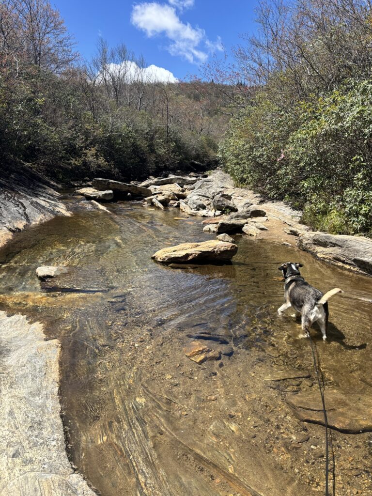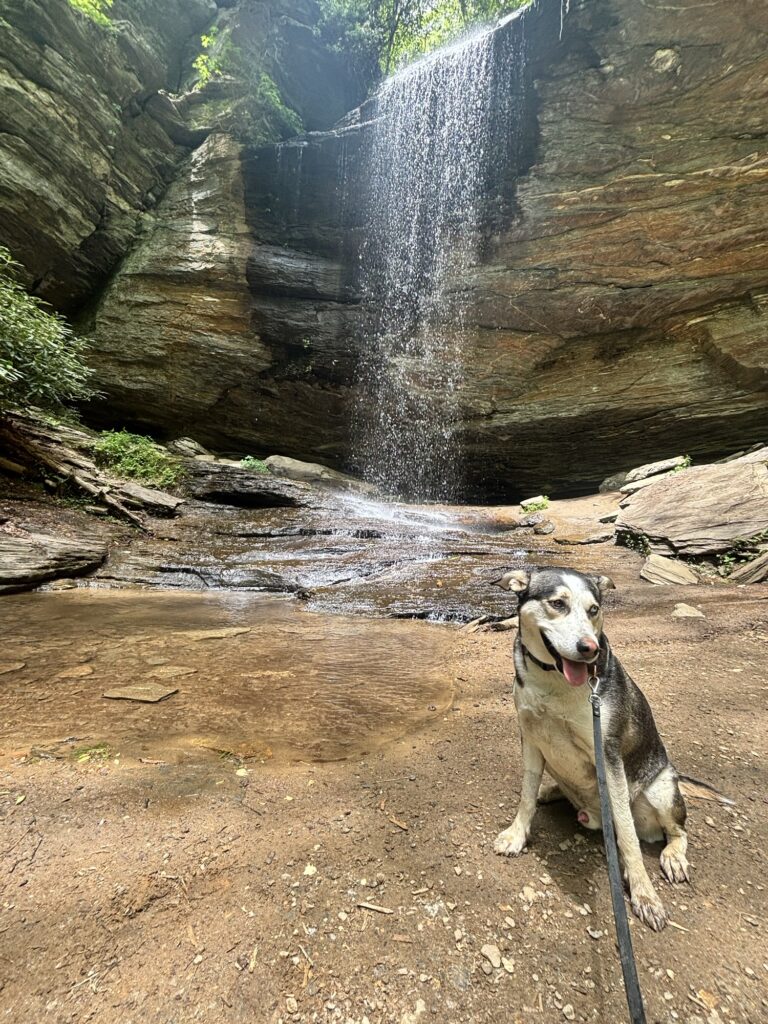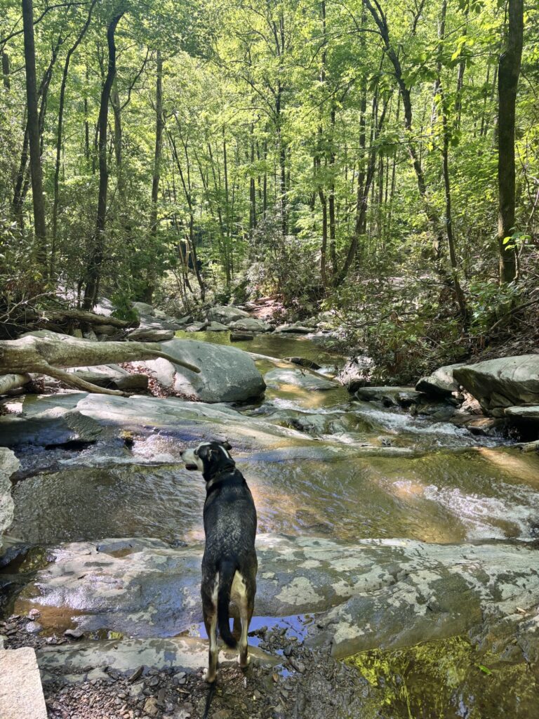 This is an easy 1.2 mile out and back trail. The trail was very crowded and we encountered many dogs along the way. There were plenty of places for Max to stop and drink from the stream. The falls are beautiful and you can even walk behind them via a cave. Parking is located across from the trail, but there is a bridge to take you to the trailhead after you have parked.