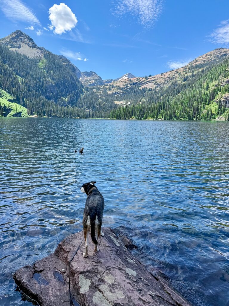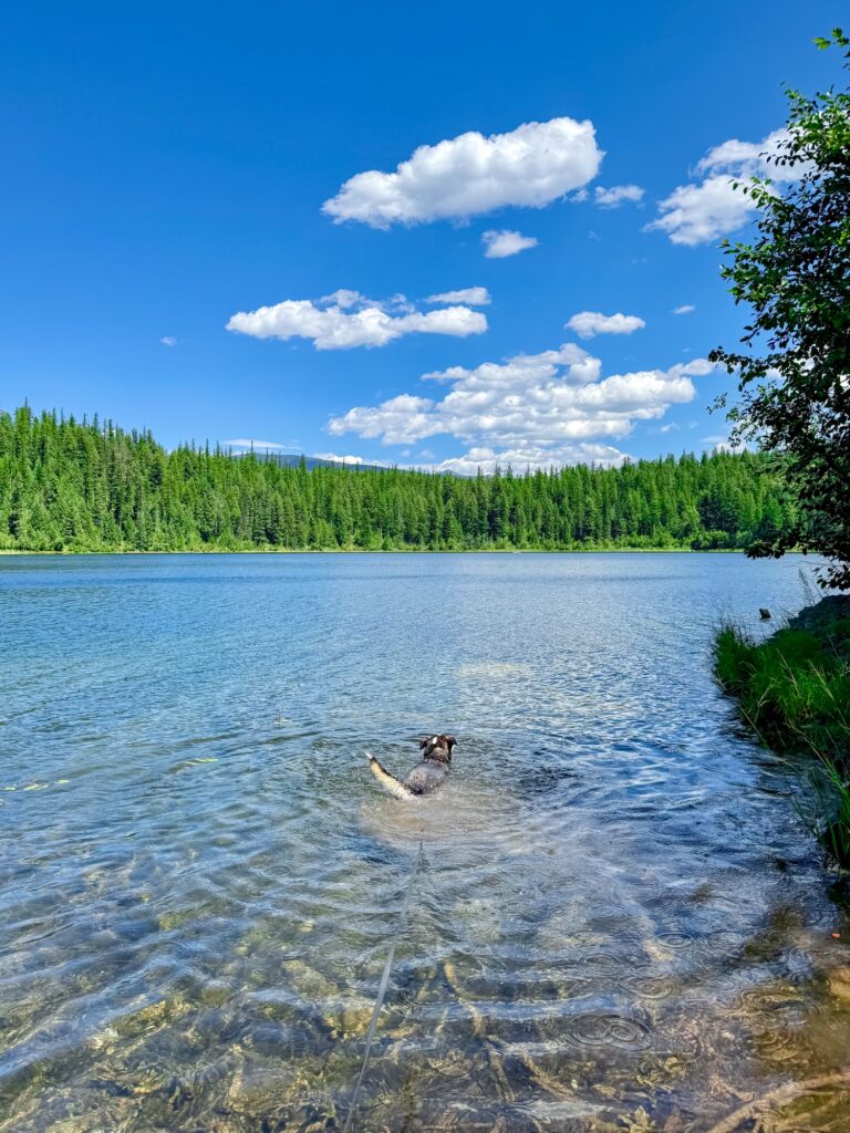 There is a 7-mile dirt road to get to the trailhead. The road does not have a lot of potholes, but the ones it does have are very large and deep. Especially be careful with the potholes located just before and after the small bridges you will drive over. There is great signage along the road, so you could easily reach the trailhead without a GPS. The first mile of this 3.5 mile out and back trail has an incline. The first 0.5 miles specifically is very steep and had me huffing and puffing. The lake is gorgeous, and Max couldn’t wait to jump in by the time we got there. My only complaint is the entire trail, even the lake, had a lot of mosquitoes and horse flies. I reapplied bug spray to both me and my dog twice and it barely helped. We were swarmed with bugs the entire time, which made us rush through the hike to get back to the car.