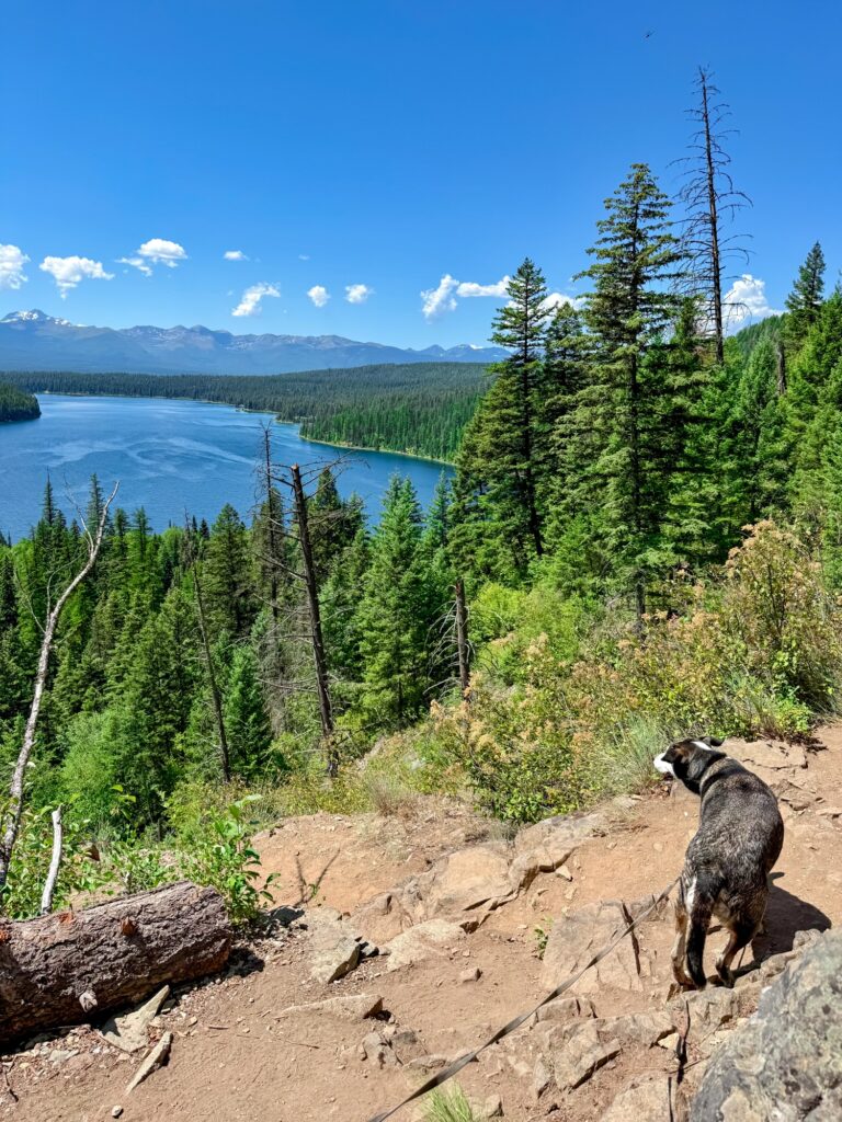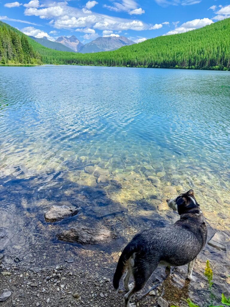 This 3.1 out and back trail is great for dogs in the summertime because the trail starts at a lake and ends at a waterfall. There is a 1.3-mile gravel road to reach the trailhead. The trail begins with access to Holland Lake right away, then meanders along the shore of the lake, where there are many access points for your dog to jump in and swim. The trail is mostly flat until right before the falls where there is an incline. There will be fork in the trail at one point. Make sure you stay to the right, where the arrow is pointing. The trail was not too strenuous, but we hiked on a very hot July day and found ourselves in direct sunlight most of the trail. The waterfall is a welcome place to cool off at the end of the hike. You will have to climb up and over some rocks to get to the base of the falls, but the spray coming off the waterfall feels amazing on a hot July day. Max loved sitting in front of the waterfall to cool off before we headed back.