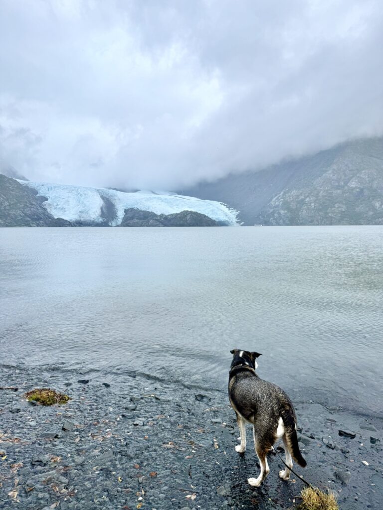 Byron Glacier trail is a flat, easy 2.2 mile out and back trail that leads to Byron Glacier and its river. This trail is very popular because of its easiness. I did not have trouble getting a parking spot, but the trail and the glacier were crowded, especially with tourists who don’t hike but want to sight see. There were many other dogs here. The best part about this glacier is, even though its not recommended, there is easy access to walk on the snow. Max had the best time getting the zoomies and digging in the snow. In fact, he definitely had the most fun out of everyone there.