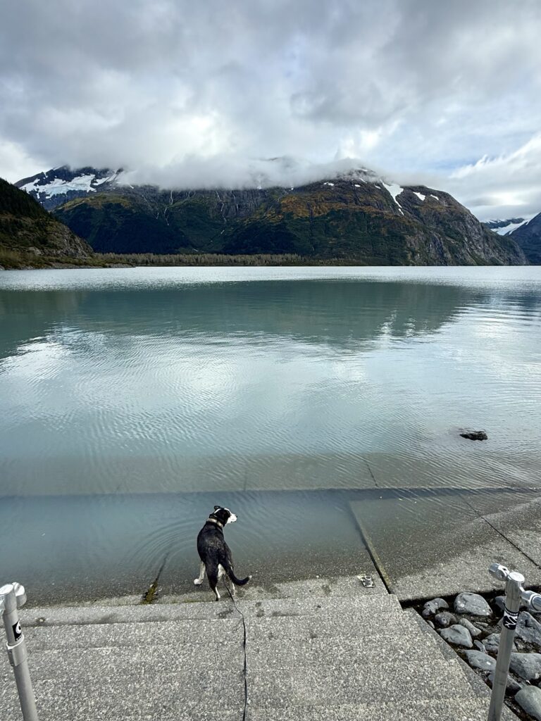 Portage Pass is a 4.5 mile out and back trail that brings you to a view of Portage Glacier and its lake. I found this trail to be very strenuous with almost no relief. The first mile is a steep incline up loose rock and gravel, making it difficult to find sure footing. The second mile to the lake is a steep downhill descent that left my knees sore by the time I got to the lake. Along the trail, you will find views of the surrounding mountains and waterfalls cascading down these mountains. The views on this trail are spectacular, although they were obscured for us since we hiked this trail in the pouring rain. On the way back, you are once again faced with the challenge of one mile of incline followed by a steep descent down loose rock and gravel. On a rainy September day, it was actually quite dangerous descending down the last mile to the car. It is truly a miracle that I didn’t slip or roll an ankle on one of the rocks. Added to the difficulty was having a leash in my hand. If I did this trail again I think I would let my dog off leash on the last mile down the mountain to have better balance and use of my hands if I fell. Of note, to get to this trail you must pass through a mountain tunnel and is there a $13 car fee to pass through the tunnel. The trailhead is on your right almost immediately after exiting the tunnel. Parking at the trailhead is ample and free. I did not enjoy the trail itself, but I did enjoy the views. Max seemed to enjoy both, proving that four legs are better than two.