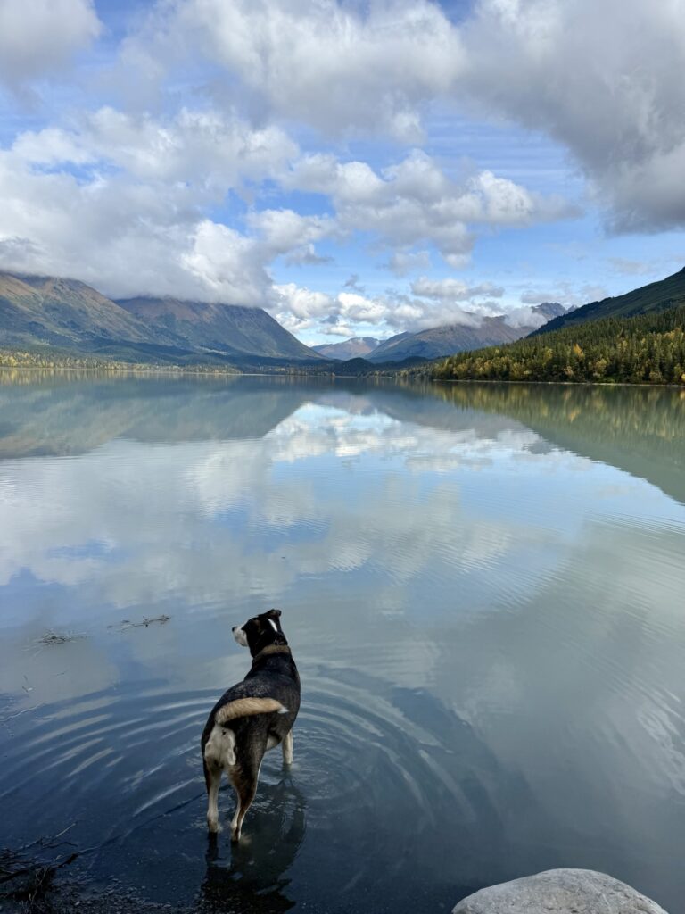 This flat, easy, paved trail is more of a nature walk than a hike. It was a great opportunity for Max and I to stretch our legs on a drive between Seward and Kenai. The trail starts in the town of Moose Pass, where you will walk up one of the main roads in the tiny town. Next, you will turn onto a paved sidewalk that sits between the highway and the lake. Max was a little nervous about the loud noise from the highway on this part. The trail ends at a campground at Upper Trail Lake. There is plenty of access to the lake here and Max even went in for a swim. We did this trail in September and it was a beautiful walk amongst fall foliage. The trail is 2.6 miles out and back.