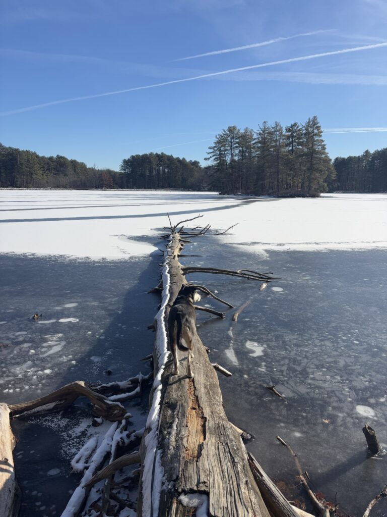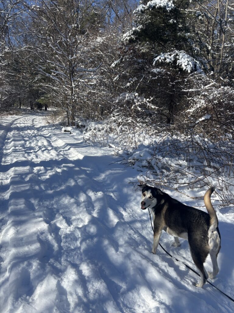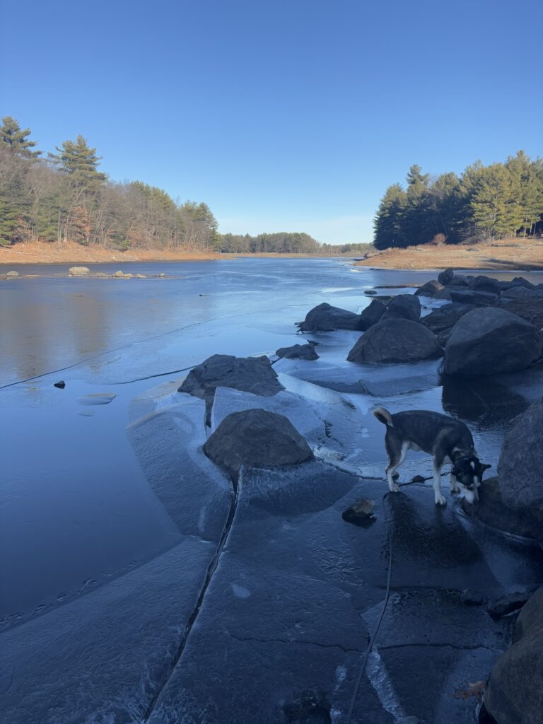 As a prior resident of Tewksbury, this is a trail I brought Max to often out of convenience, but also because of its gorgeous views year-round. The trail takes you through pine trees, past a large bog, then out to a large field and down around a corn field. There is also access to the old Tewksbury Hospital Cemetery. We have encountered off leash dogs here a lot, but always friendly and we never had an issue. Many owners allow their dogs off leash to run down to the bog and take a dip in the water. A hidden gem is located right across the street from the cemetery parking lot: Farmer Dave’s. The open hours are less frequent in the winter- you will have to check the sign out front to catch them at the right time. This farm stand sells fresh produce and home baked goods. I always get the home made sweet potato dog treats. Even though there is food inside, they always allow Max to come in with me and offer him a dog treat!