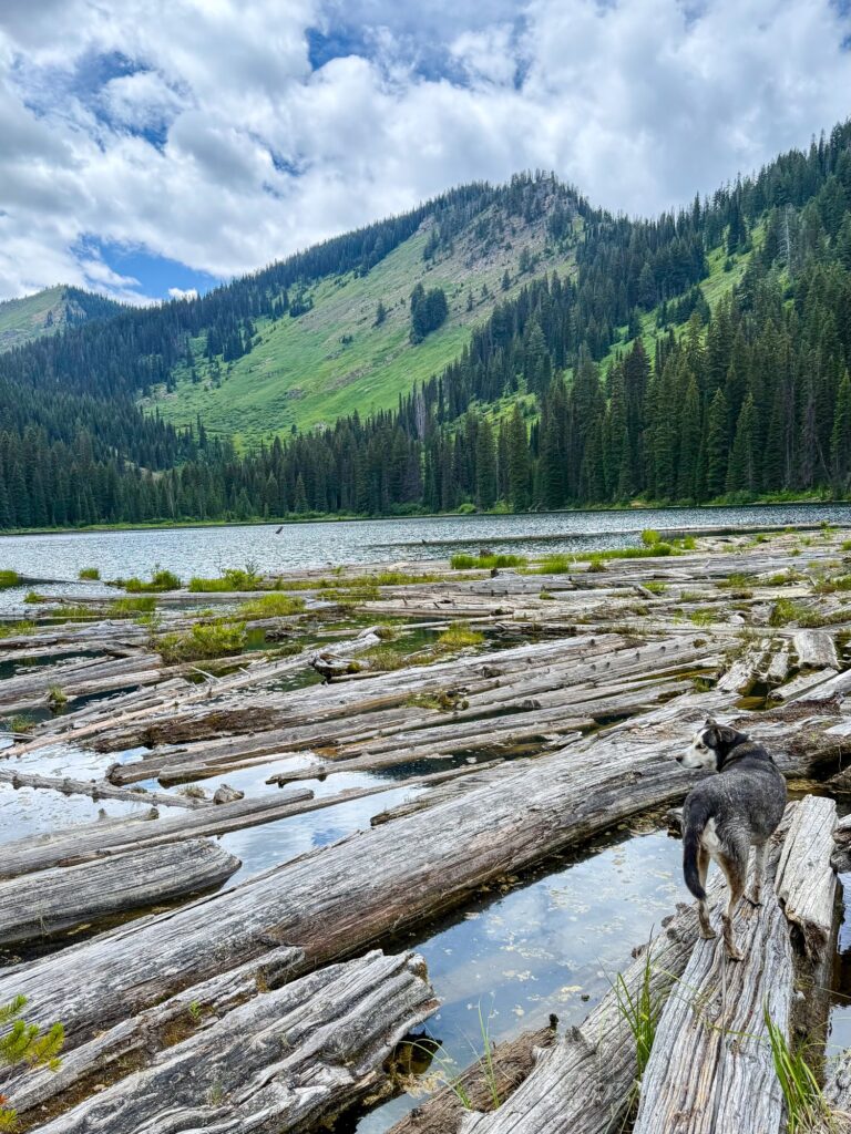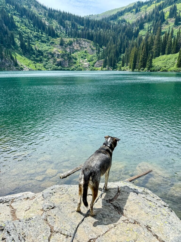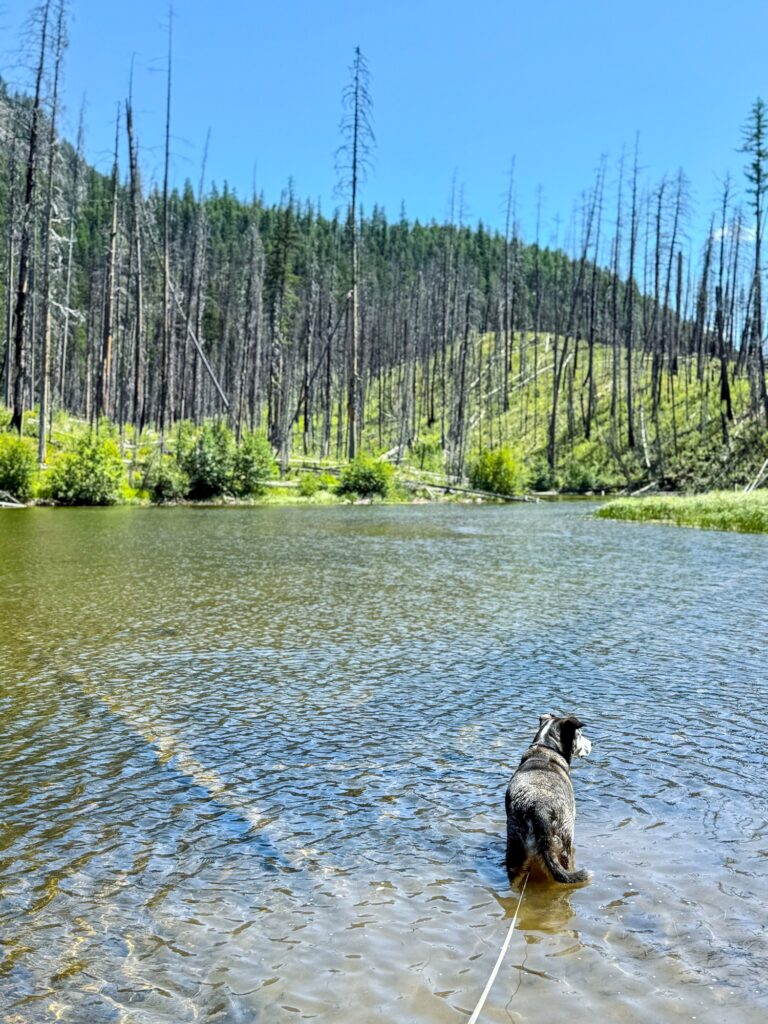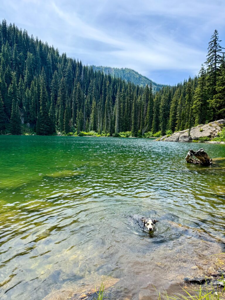 Morrell Recreation Trail is a 5.5 mile out and back trail, considered generally easy. There is a seven-mile dirt road to get to the trailhead. Because this portion of forest suffered from a wildfire, the trail is not well shaded at all. I found the trail to still be beautiful, as you could see remnants of the burnt trees above as well as new growth starting below. I found the trail to be excessively dusty: by the time I got back to the car everything I was wearing, my backpack, and my dog were all absolutely covered in dust. This trail was very crowded with other hikers, mountain bikers, and other dogs. The mountain bikers were a bit annoying because the trail is very narrow, and there wasn’t a lot of space for me to “pull over” with my dog to let them pass us. Towards the end of the trail, you will first pass a pond, then Morrell Lake, then end at Morrell Falls. Max swam in all three, though the bottom of the pond was like a quicksand/muck and made me nervous for Max to walk through. I was waiting for it to just suck him right in. The lake is much cleaner. At the waterfall, I got to witness a proposal! There were lots of other dogs at the waterfall that Max was able to play with. This trail is not particularly difficult, just long and hot in the July sun. Only a few minutes from this trail is Salmon Lake State Park. Since Max and I were covered head to toe in dust from the trail, we pulled into the state park and took a swim in the lake to cool off and rinse off. I highly recommend this!