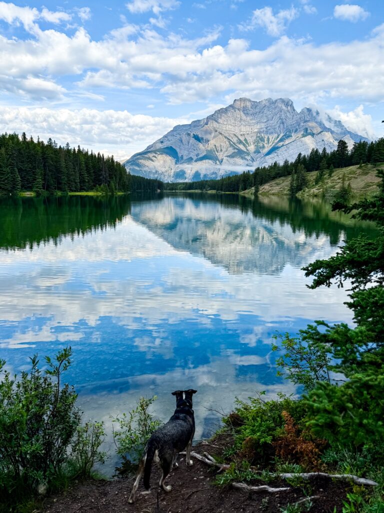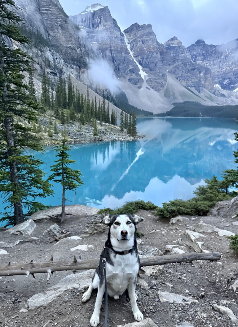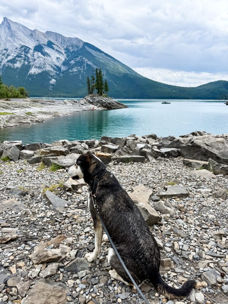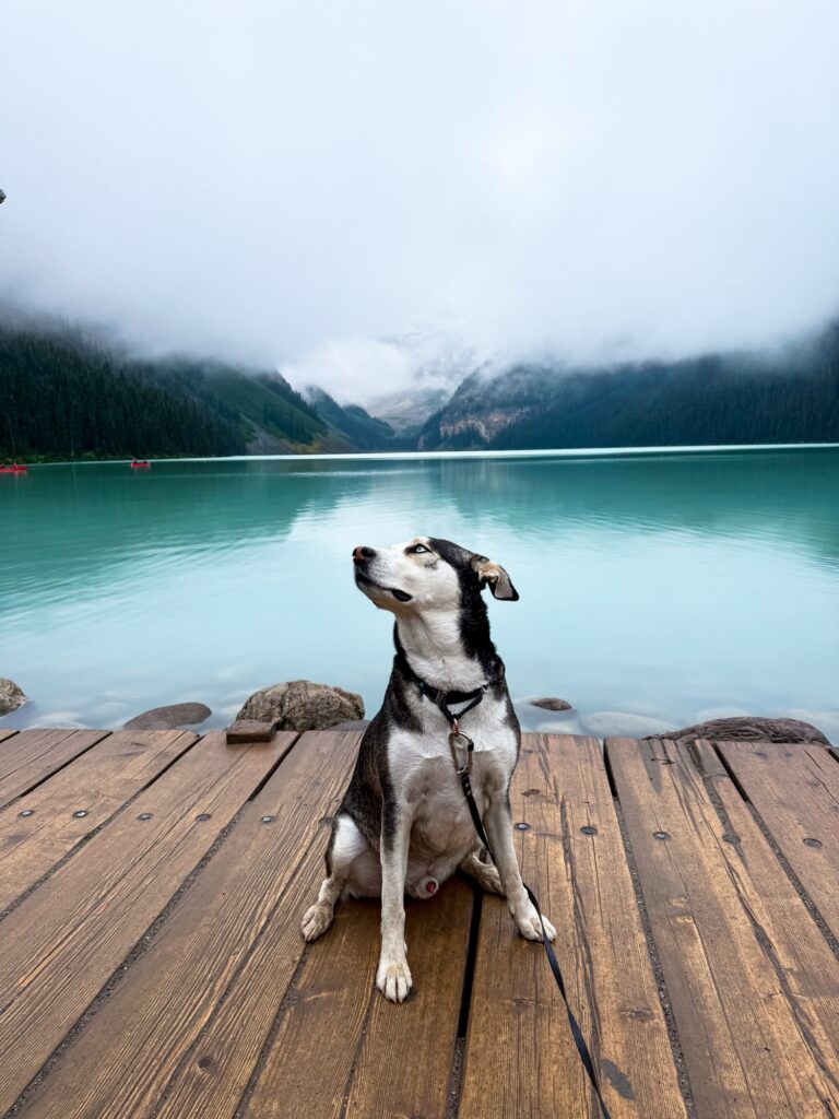 The famous Moraine Lake! I set my alarm for 2:30 AM to make it to Lake Moraine at sunrise. Max was not too happy with me. Cars are no longer allowed access to Moraine Lake, so the only way in is to book a shuttle. Thankfully there is ONE shuttle company that allows dogs: Fairview Limousine. We met the shuttle at a local hotel parking lot at 4:45 AM. Max did great on the bus and mostly napped because it was still dark outside. Our group made the 0.5 mile out and back trek to the “rock pile” to watch the sun come up. After sunrise, Max and I walked the Lake Moraine Lakeshore Trail, which is any easy 2.3 mile out and back trail along the shores of the lake. The views did not disappoint. This was my favorite activity of the trip.
