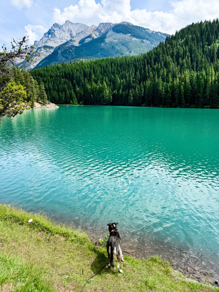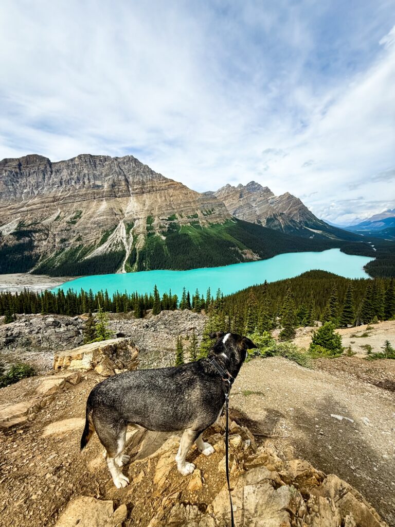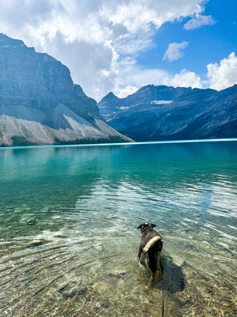 I accessed Peyto Lake via Caldron Peak Trail. This is a 2.5 mile out and back trail. The parking lot was full when we got there, as the lookout area on this trail is very popular. There was also a very long line to use the bathrooms. The good news is there is plenty of parking alongside the road and it was worth walking a little further and parking on the side of the road. The first section of this trail is a paved uphill path to the lookout point, which takes the form of a wooden observation deck. Be prepared for big crowds on the paved trail and at the observation deck. You will also notice some trails through the woods just before the deck where some, but not as many, people will gather to take pictures of Peyto Lake. The crowds really thin out as you pass the observation deck and turn left. You will see a summit trail straight ahead and an unmarked trail to the right going downwards. You want the trail to the right. There will be a white sign warning about a collapsed bridge (this doesn’t affect you getting to the lake). This trail descends down the mountain, then turns into steep switchbacks down the mountain. The last section consists of steep switchbacks down an open wildflower field with some loose gravel. The trail opens up at the base of the lake, where you may need to cross some creeks to get to the lakeshore. Max went for a swim and then laid down to rest. I sat down with him on the rocks to rest my knees, which were killing me from the steep descent to the lake. We had the entire lake to ourselves. Taking the trail back up is even worse. I had to stop at the corner of every switchback on the wildflower meadow section. Next you have to survive more switchbacks up the mountain. I had an extremely difficult time coming up this trail despite it being labeled “moderate.” For me, personally, I would label this trail as “hard.” The entire return is an uphill battle, and I don’t think the reviews prepared me for just how difficult it was going to be. On the way up, I did pass a group coming down the trail that included two very young children and an adult with a baby strapped to her, which surprised me given the difficulty of the trail but also made me question if I am just weaker than the average hiker.