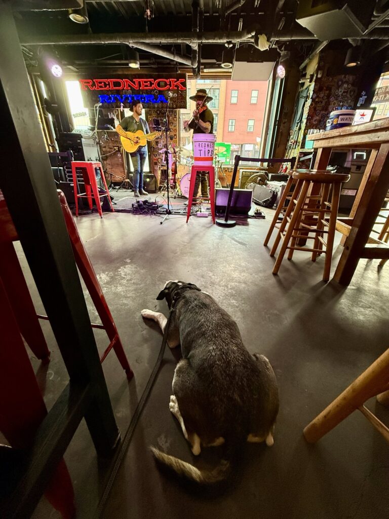 Just around the corner from the Johnny Cash Museum is Redneck Riviera on Broadway Street. They are dog-friendly both inside the bar and up on the rooftop deck. They offered Max a treat upon entry and he loved sitting front and center in front of the band. While I enjoyed my chicken taco lunch, Max enjoyed the band and even got some pets from the lead singer! Their rooftop offers a quieter space and opens at noon.