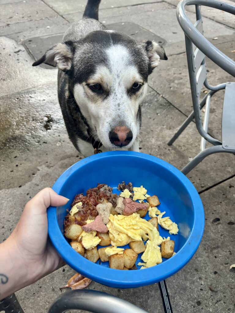 Start your day early at J. Christopher’s, which opens at 7 am and offers a dog-friendly patio and even a dog menu! They brought Max a water bowl and served him the “Puppy Chow” — a mix of potatoes, bacon, sausage, and scrambled eggs. A perfect Southern start for both of us.