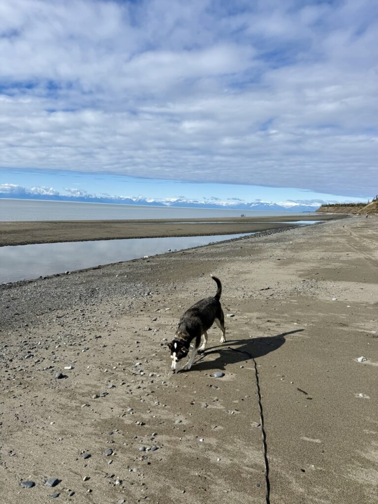 The sun came out just in time for our visit to Kenai Beach. Max had fun digging in the sand and exploring the rocky shoreline. We saw vehicles with four-wheel drive right on the beach, but I didn’t want to risk getting stuck, so I parked in the parking lot and walked out to the beach. From the shore, you can see white mountains tops lining the skyline where ocean meets sky. The waters here are known for Beluga whales. This is a must-see stop in Kenai.