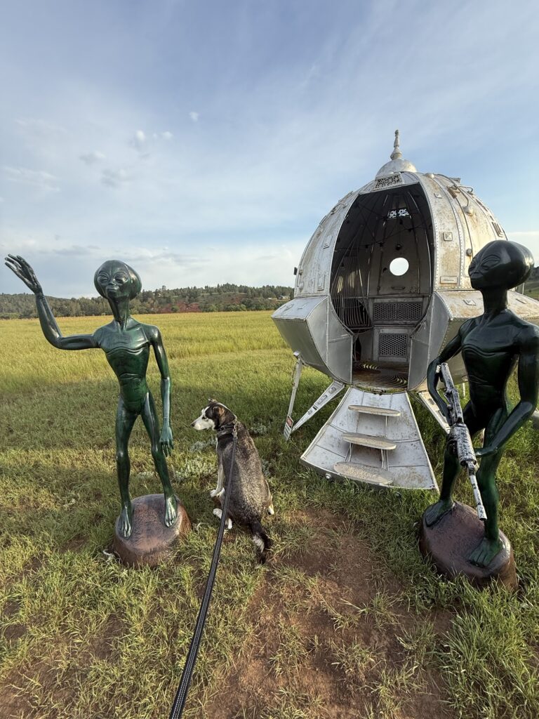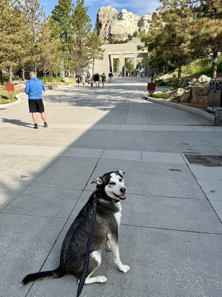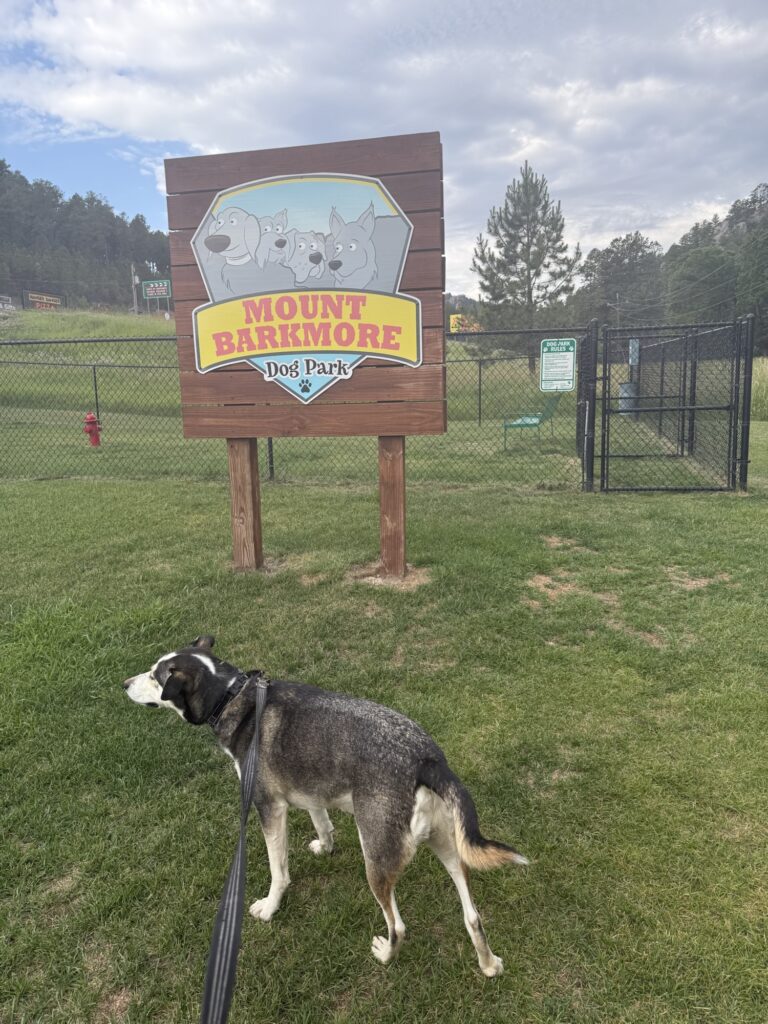 The next morning, you want to head to Mount Rushmore, which is about 30 minutes away from Battlecreek Camping Resort. It costs $10 for parking/entry. Leashed dogs are welcome, but only a few feet into the entrance. It is enough that I could see Mount Rushmore and snap some pictures, but if you had someone else with you, you could take turns watching your dog while the other person went further into the park. After visiting the park, we drove down the mountain to the city, Keystone, that sits below it. I got a smoothie and a breakfast sandwich at Grapes and Grinds. Dogs are allowed in the large patio area, but not inside the cafe. However, someone very nicely came outside and took my order! He even brought Max a pup cup! Right behind the cafe is a dog park called “Barkmore,” where Max ran around and had a potty break before we hit the road. On your way out of Keystone, you will pass by Custer State Park. We did not have time to check it out, but this is another dog-friendly activity you could explore!