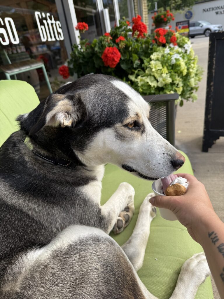 Rapid City is about one hour from Badlands National Park. This mini city offers a lot to walk around and explore. First, head to Paddy O’Neil’s Irish Pub, where you and your dog are allowed both outside on the patio and inside where there is air conditioning. Since it was a very hot July day, we opted to sit inside in the cool A/C. They immediately brought Max a water bowl. I ordered chicken wings to start and Max enjoyed eating all the carrot sticks that came with them. After lunch, we walked around downtown and checked out all the statues of the presidents. Rapid City is known as the “city of presidents” because dispersed downtown are lifelike statues of every single US president! Lastly, we headed to The Cookie Shop, where I ordered an ice cream cookie sandwich and a single scoop of vanilla ice cream for Max!
