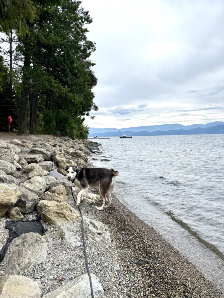 Flathead Lake State Park has 185 miles of shoreline and there are thirteen access points to the lake. I recommend West Shore because it offers hiking trails, camping, and boat access. This location also offers SUP and kayak rental right by the boat ramp. Entry cost me $8 as an out of state vehicle for a day pass. I parked close to the boat ramp and then accessed the trails from there. One trail follows the lakeshore and has picnic tables and lots of access to the lake. Max was too afraid of the rolling current to jump in, but he did lap up some sips of the clear water. After our hike, we meandered along the little rock beach, located in front of a grassy area with picnic tables and a bathroom. We loved the trails and there were a few other dogs we met along the way.