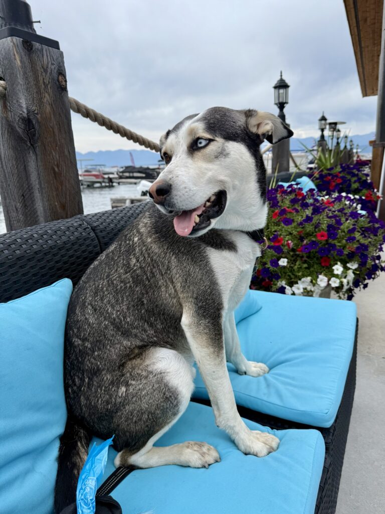 You cannot beat the views at Harbor Grill. Only a few miles from Flathead State Park/West Shore, this restaurant has a plethora of outdoor seating with a view of the harbor. There is even boat parking if you were boating on the lake and wanted to stop by for lunch. The parking lot is small, but there is extra parking across the street down a little dirt road. The patio consists of a large bar, high and low top seating, and an outdoor patio sectional. There are beautiful flower displays everywhere you look. I loved the playlist at the bar. It took me back to high school with bands like Yellowcard, Paramore, All American Rejects, and Hinder. Max was brought a water bowl when we sat down and I ordered him a plain cheeseburger. The food was phenomenal. There were other dogs on the patio as well and everyone was very well behaved. The tables all have umbrellas, so Max was shaded from the sun and the short rain shower that surprised us.