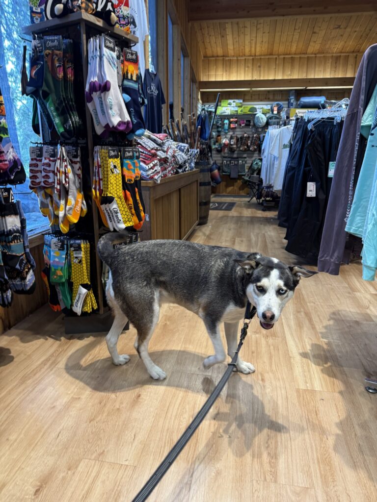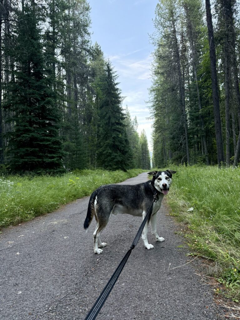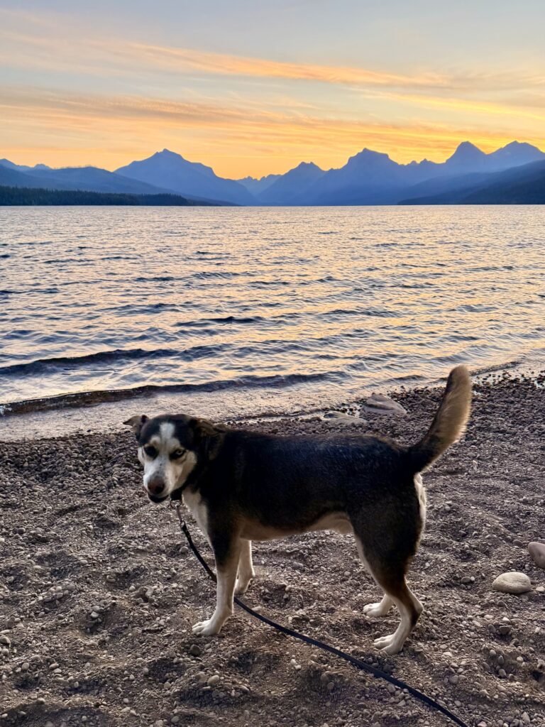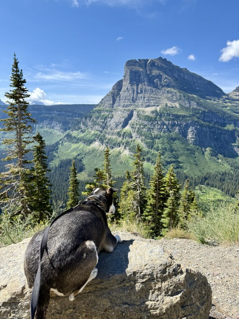 Glacier National Park doesn’t have a whole lot you can do with a dog since all the trails do not allow them, but there is enough to make a day out of. First, you can park at Apgar Village and watch the sun rise over Lake MacDonald. Then, you can walk the paved bike path for 2.5 miles to West Glacier, and then back. Next, you can grab breakfast or lunch in Apgar Village. Eddie’s Cafe does not allow dogs inside or on the patio, but they did allow me to order something to go and then we found a picnic table close by to eat at. There are windows for ice cream and coffee in Apgar Village so those are other options as well. Next, bring your dog with you to do some shopping in Apgar Village. Max loved exploring The Cedar Tree and the staff there was very good to him. Last but not least, hop back in your car and take a scenic drive down Going to the Sun Road. This is a stretch of about 50 miles of Glacier National Park where you can stop and let your dog out to stretch and take in the view on the many scenic overlooks. The first 20 miles is a beautiful drive through forest that follows the MacDonald Creek. The last 30 miles climbs up, over, and around mountains with breathtaking scenic views. There is no shortage of places to stop along the road.
