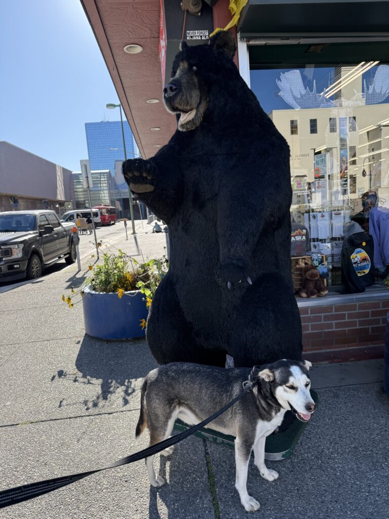 Downtown Anchorage is very walkable, and parking is easy to find. Max and I went downtown twice to go shopping and explore some of the art, statues, and history. There are also ample restaurants and breweries. Many of them have seasonal patios where your dog can join you. Wild Scoops is a seasonal ice cream shop where you can order at the window and share an ice cream with your dog as you walk around downtown. Our favorite gift shop was Grizzly’s Gifts, where Max was welcome to peruse the store with me. He even picked out his own Moose bone in the pet section.