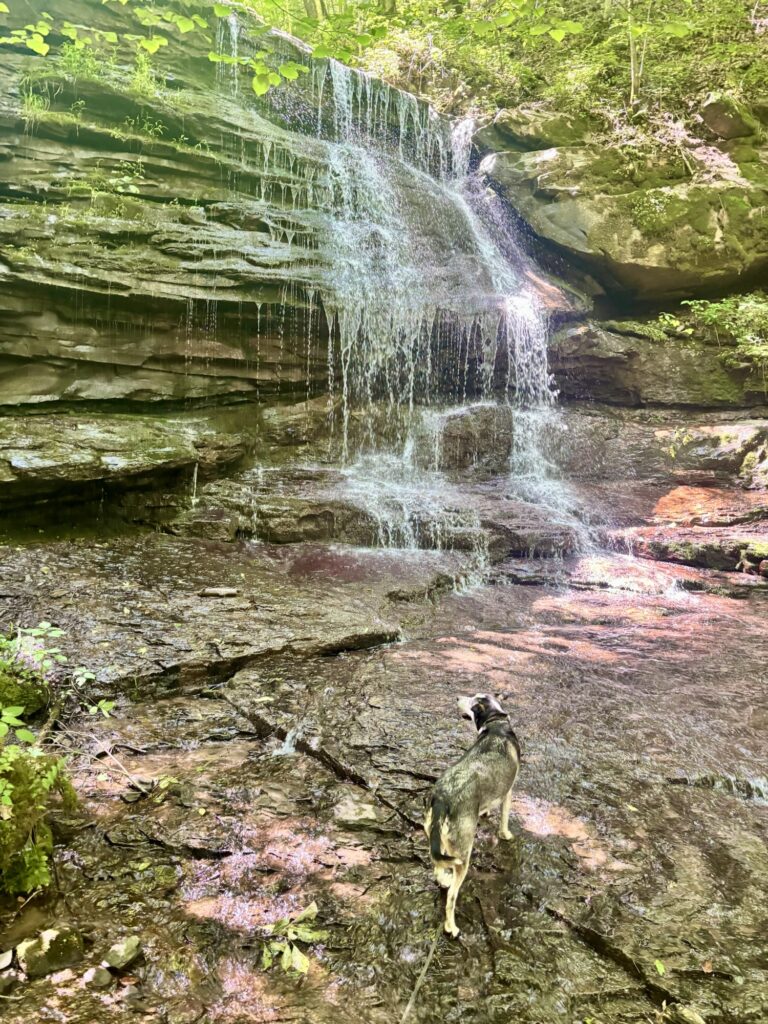 The second trail we did in this national park was Big Branch Trail, which led to a waterfall. This trail is a 1.8 mile loop. We started with the trail on the left, which takes you up the river to the falls. Then instead of doing the loop, we took the same path back down. Some sections were very muddy and pack bug spray because it was very buggy and I had to reapply. There were three very easy creek crossings. The parking lot is located across the street, where Max took a dip in the New River after this hike.
