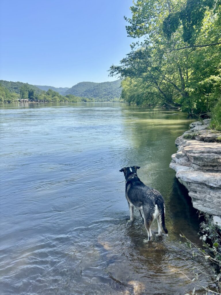 This was the first National Park my dog has been to! The best part about New River Gorge National Park is there is no entrance fee AND all of the trails are dog-friendly here! We first did the Sandstone Falls and Island Loop trail, which was a flat and easy one mile loop. There were plenty of places that Max could stop and swim in the river. I was warned by a little girl about a copperhead snake that was spotted at the entrance, so be careful if your dog, like mine, is curious about snakes. There is a boardwalk portion of the trail that was very crowded and touristy, but the trail through the woods was much quieter.