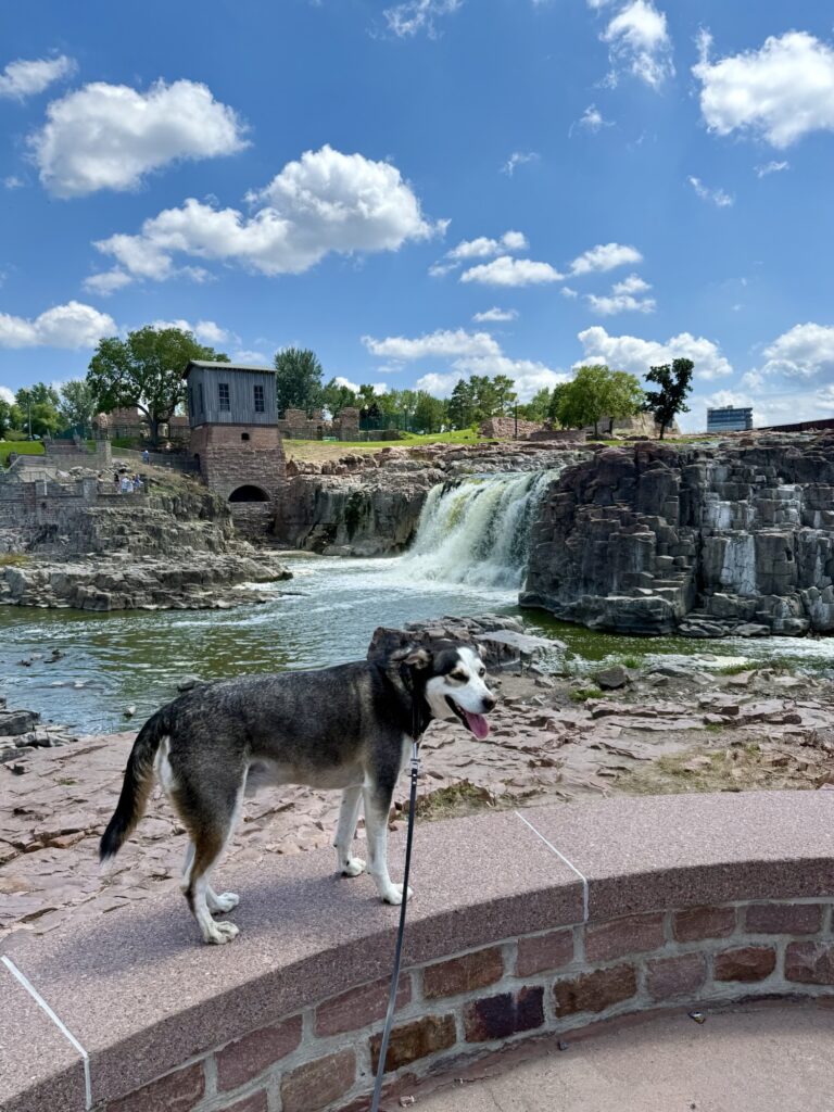 Falls Park offers a grassy lawn, paved walking paths, and views of the Sioux Falls. Dogs are welcome on leash. There is plenty of space to explore the rocks that surround the falls as well. You will also find a watch tower and a bridge to view the falls from. Further down, if you follow the river, you can spot some enormous catfish in the water. Parking is free in the designated parking lot. Since we went on a hot July day, Max did go for a swim in the falls, but I will admit the water did not look very clean.