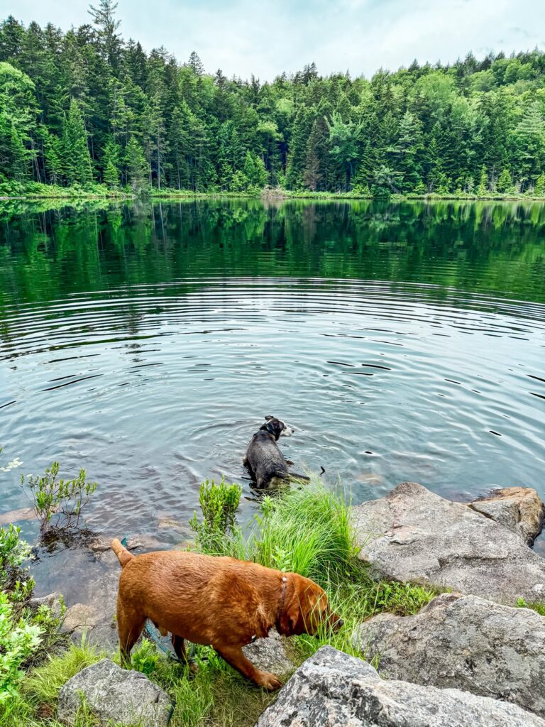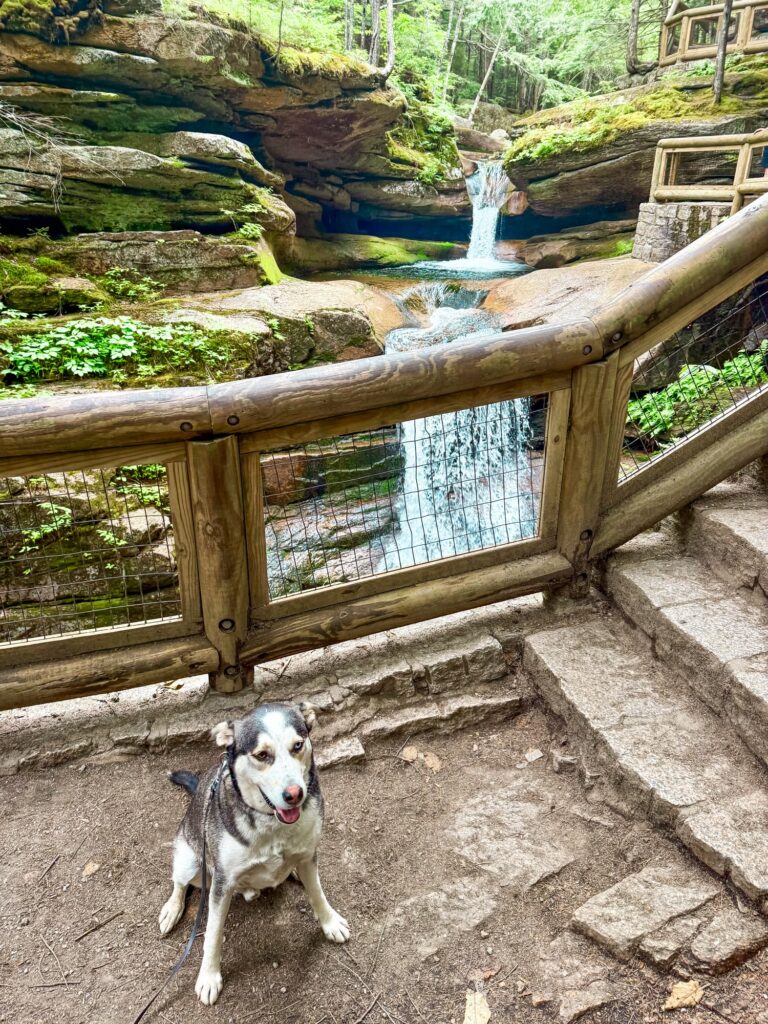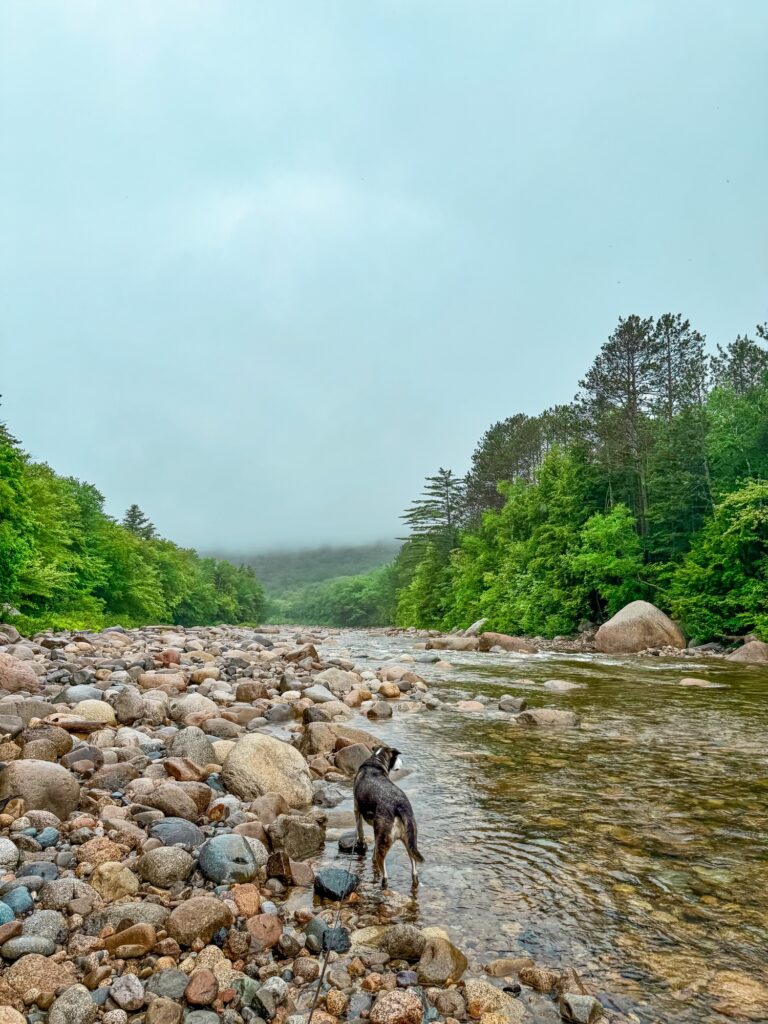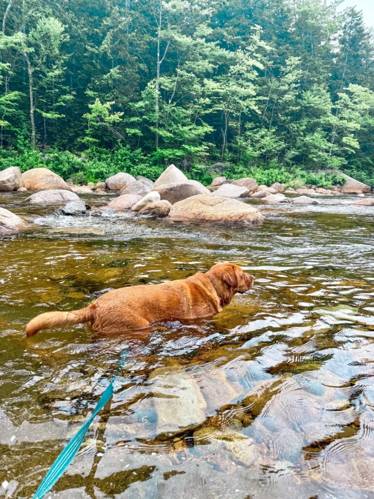 The Franconia Falls Trail is a 6.9 mile out and back trail that follows the Pemigewasset River to a waterfall. The best part about this waterfall is it forms a natural slide, so this is a common place for swimming and families. The trail itself is flat and easy, it’s just long with 3.5 miles before you reach the falls. We did this hike on a very hot summer day and there were not as many opportunities for Max to jump in the river as I thought there would be. Some of the riverside is up on a cliff and some is blocked by deep brush and forest. There were a few smaller streams along the way that he was able to drink from, but I really wanted him to go for an all-out swim along the trail so that he wouldn’t overheat. By the time we got to the falls, Max was quite hot and exhausted. He went for a swim and then took a nap on the rocks. It was another long walk back to the car. He had a lot of fun, but I would probably do this hike again with him closer to the fall when the temperatures are a bit cooler.
