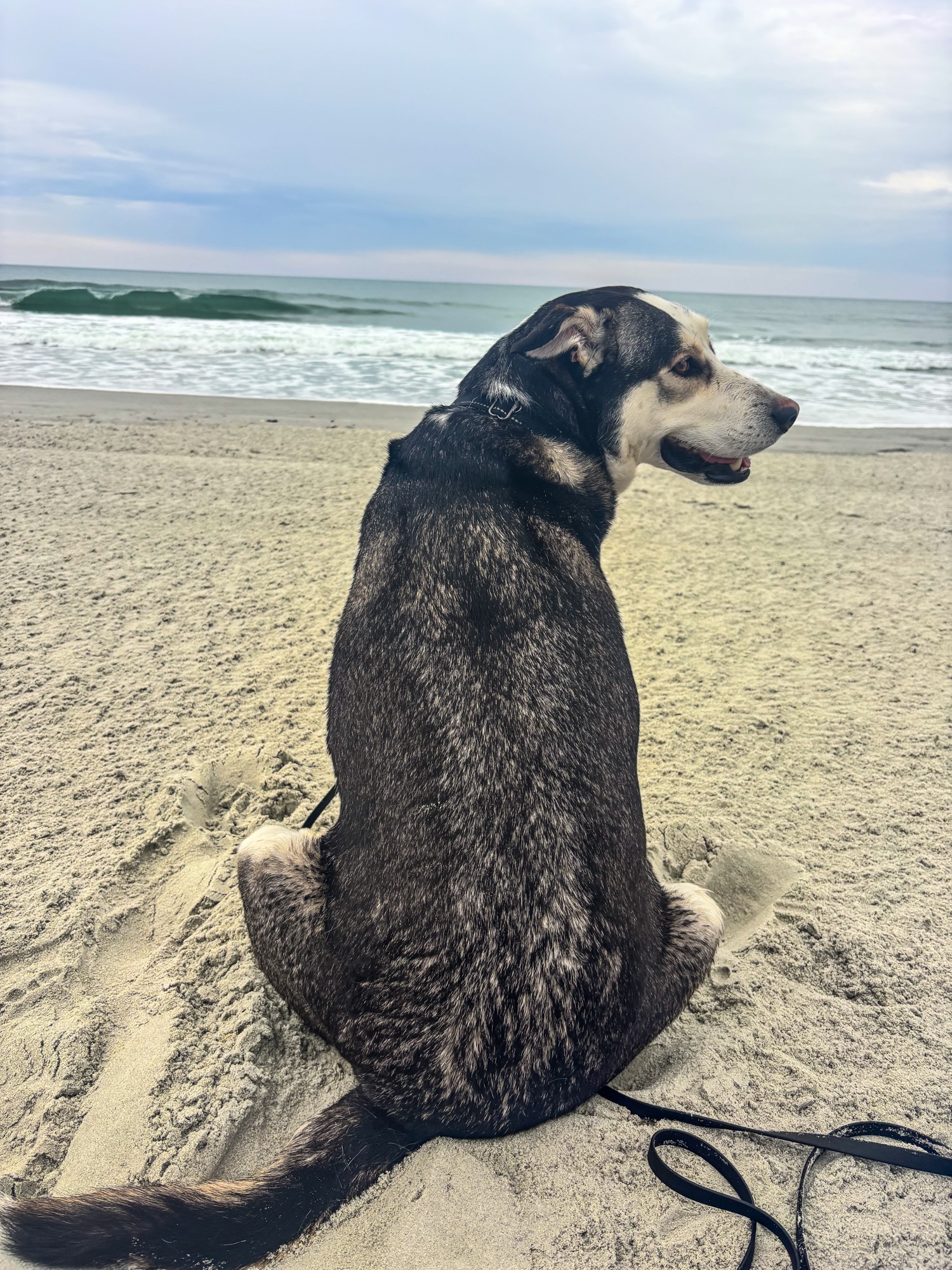 Max ran, dug, and lounged happily on the sand. While there were quite a few dead jellyfish washed up on shore, Max thankfully ignored them.