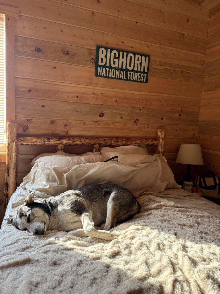 The town of Shell has a population of just 74 people. You definitely want to stop for gas and food before you get here. We stopped in Greybull for everything we needed, then headed into Shell to stay in a cabin at Shell Campground. The cabins have bathrooms, a mini fridge, a microwave, and wifi. There is also an on-site laundry room with coin-operated machines. The town literally only consists of this campground, a bar, a post office, and a small store/cafe combo. However, the cabins are dog-friendly and the campground is well taken care of, with many grassy spots and a little creek running by. We had a very comfortable, peaceful stay here. For our morning walk, we would walk from the campground to the store/cafe, where they had a very large backyard area that was grassy with trees and picnic tables. Max would walk around the yard sniffing and exploring, then we’d head back to the cabin.