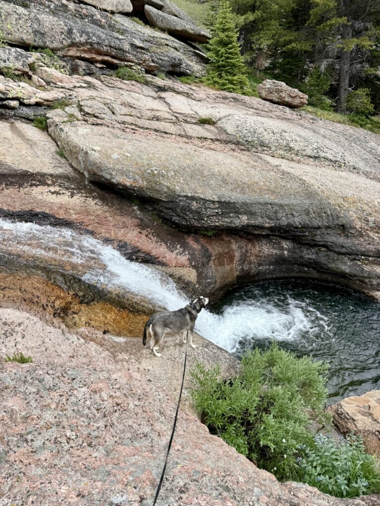 Max and I did three dog-friendly trails in Bighorn National Forest. Our first stop was to North Cove Boating Site. On the northern shore of Meadowlark Lake there is a large parking lot and boat ramp. Just passed the boat ramp is an out and back trail along the shore of the lake that boasts beautiful wildflowers. What drew us to this trail, though, was that it was a hot July day and Max needed to go for a swim! Our next hike was Paradise Falls, a 1.6 mile out and back trail in Bighorn that leads to a waterfall. The trailhead is off Forest Road 121, but the forest road is not well marked and there is no sign at the trailhead, so it can be difficult to find. The dirt road eventually becomes circle of dirt and there are remnants of a fire pit- that’s how you will know you’ve reached the end. Then, the trail kind of branches off this dirt road. When I arrived, there were no other cars so I was confused as to where the dirt road ends and the trail begins. If there are cars parked there, it will be more obvious. There will be a tricky descent down in the begining, then some nice rolling meadows. When you reach the waterfall you will be on top of it, on some slippery rocks. I guess there is a route down to the base of the falls, but I could not find it and it was quite slippery as it was drizzling out so I didn’t want to risk going any further. Lastly, Max and I hiked Porcupine Falls. This trailhead is very easy to get to and very obvious. The trail is only 0.8 miles out and back, but you will get a good workout in on the climb back up from the falls. The way down is a quick switchback and then many, many stone steps to the bottom of the falls. The waterfall is gorgeous and definitely worth the difficult ascent back up, but coming up all those steps was challenging!
