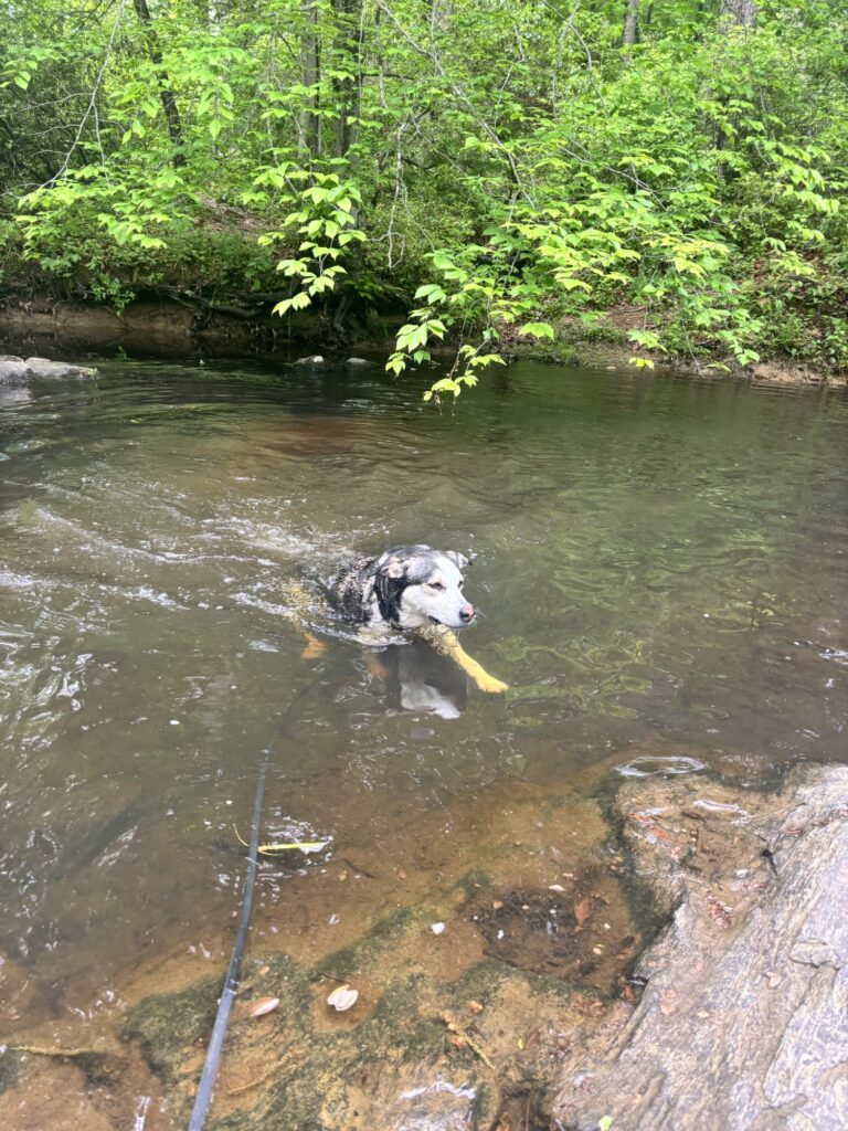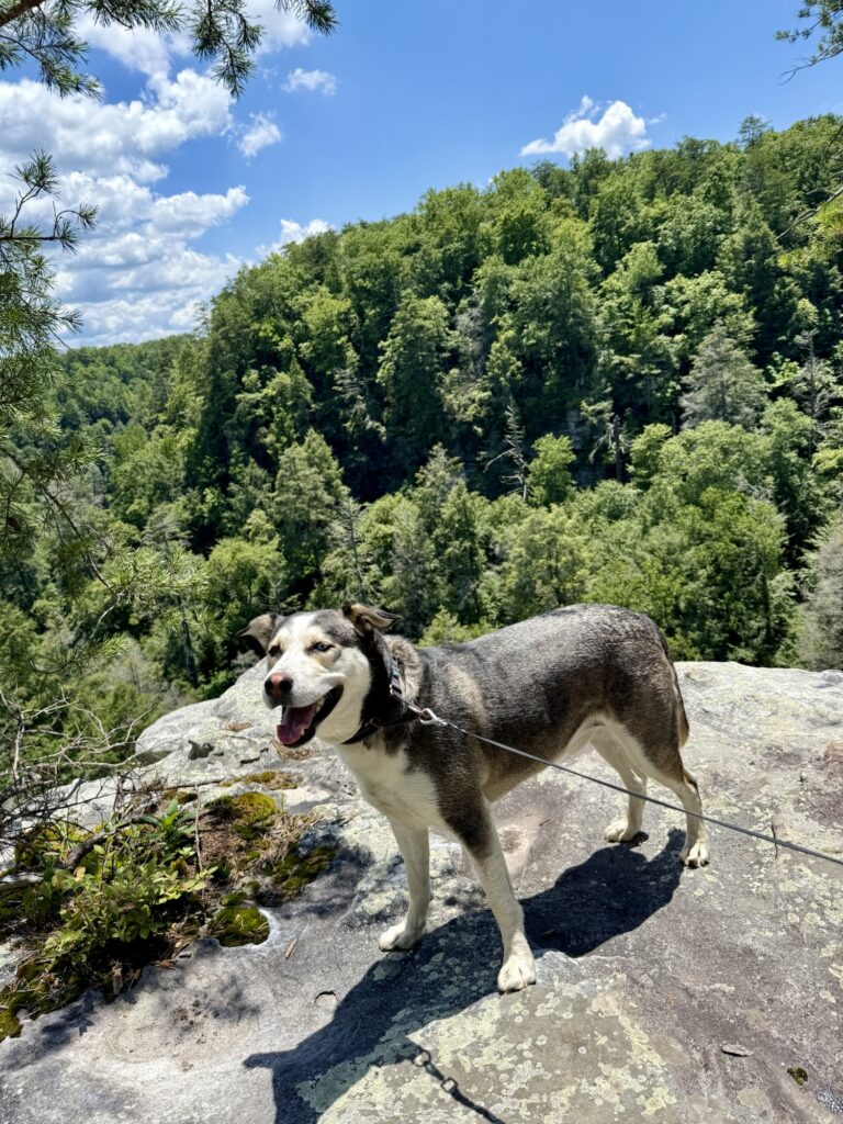 Fall Creek Falls is a free entry state park in Spencer, Tennessee. The park has many hiking trails and several waterfalls including Fall Creek Falls, Piney Falls, Cane Creek Falls, and Cane Creek Cascades. Max and I hiked Paw Paw Trail, which was a three-mile loop. There were multiple spurs off the trail leading to outlooks with gorgeous views. We went on a very hot (more than 90 degree) June day, so this trail was tough for Max. He needed many water breaks. The trail is mostly shaded, but the only place for him to swim was in the river at the very beginning of the trail. I do wish I chose a trail with more water features along it so that he could cool off. However, after the hike and only a very short walk from the trailhead is a swimming area below the waterfall. Behind the nature center and down some wooden stairs, you will find access to a very popular and crowded swimming spot. The waterfall pours into the river and you can find dogs and humans cooling off both in the river and the waterfall. Max was relieved to have a place to swim and cool off after our hot hike. He even made a doggy friend in the water.