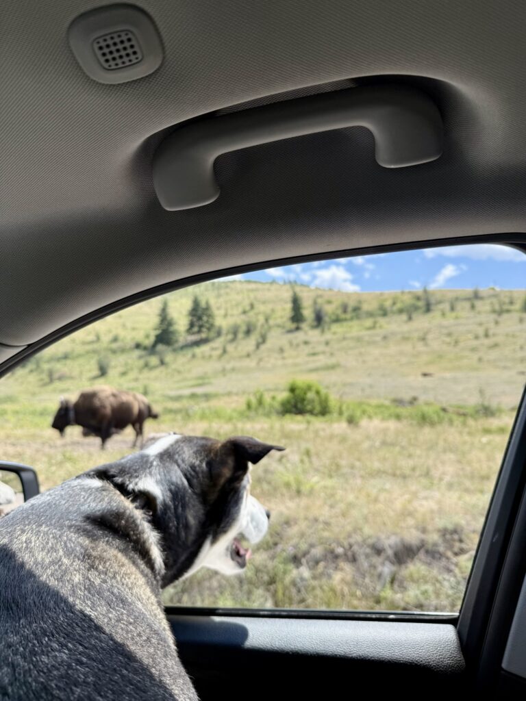 Only about twenty minutes from town is the National Bison Range. For $20, you have access to a two-hour scenic drive up, around, and down a mountain with roaming bison. There are even a few trails along the drive where you can stop and get out to walk and stretch your legs. I was surprised at how lax their rules were. Dogs have to be on a leash at all times, but your car windows are allowed to be down, and you are even allowed to step out of your car, just not walk away from it. Max loves hanging his head out the window and getting a good look and smell at the bison.