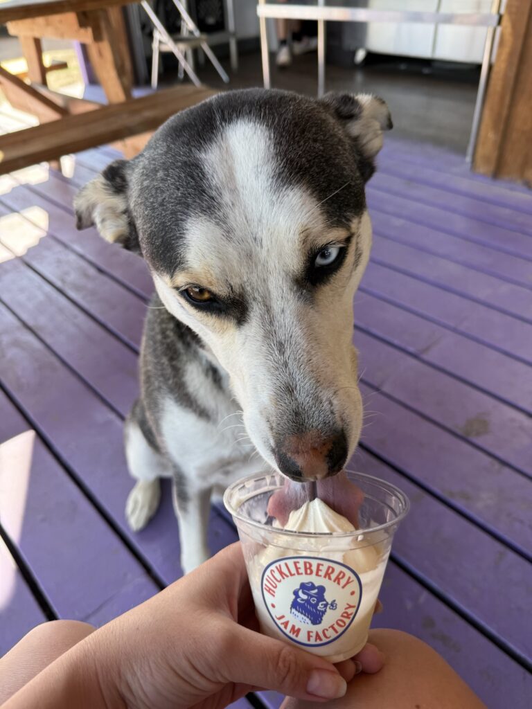Located in central St. Ignatius and virtually side by side are Treat and the Huckleberry Jam Factory. Treat offers smoothies, coffee, ice cream, and chocolates inside an adorable store so you can both shop and relax. I got a huckleberry lemonade for myself and a scoop of vanilla ice cream for Max and then took it out to the car with me. There are shaded, outdoor tables next door at the jam factory if you wanted to stay and eat. The Huckleberry Jam Factory offers delicious “smash burgers”, ice cream, and cheesecakes, as well as jam. Max and I sat on the covered patio and shared a burger, then got some huckleberry ice cream. Delicious!