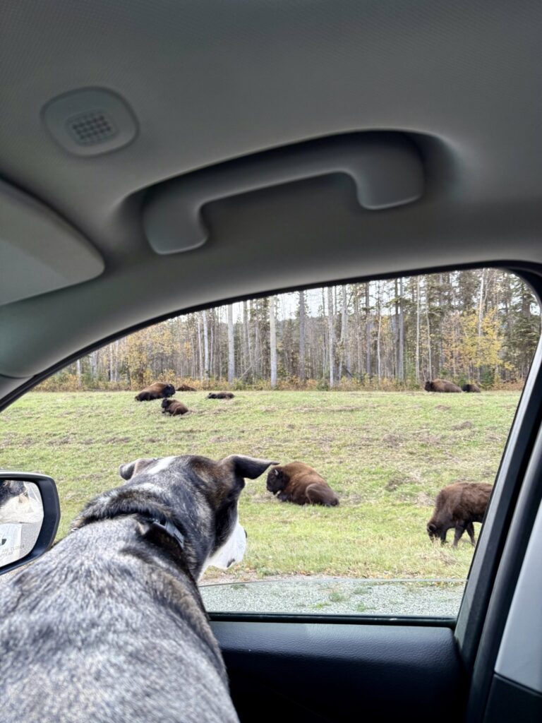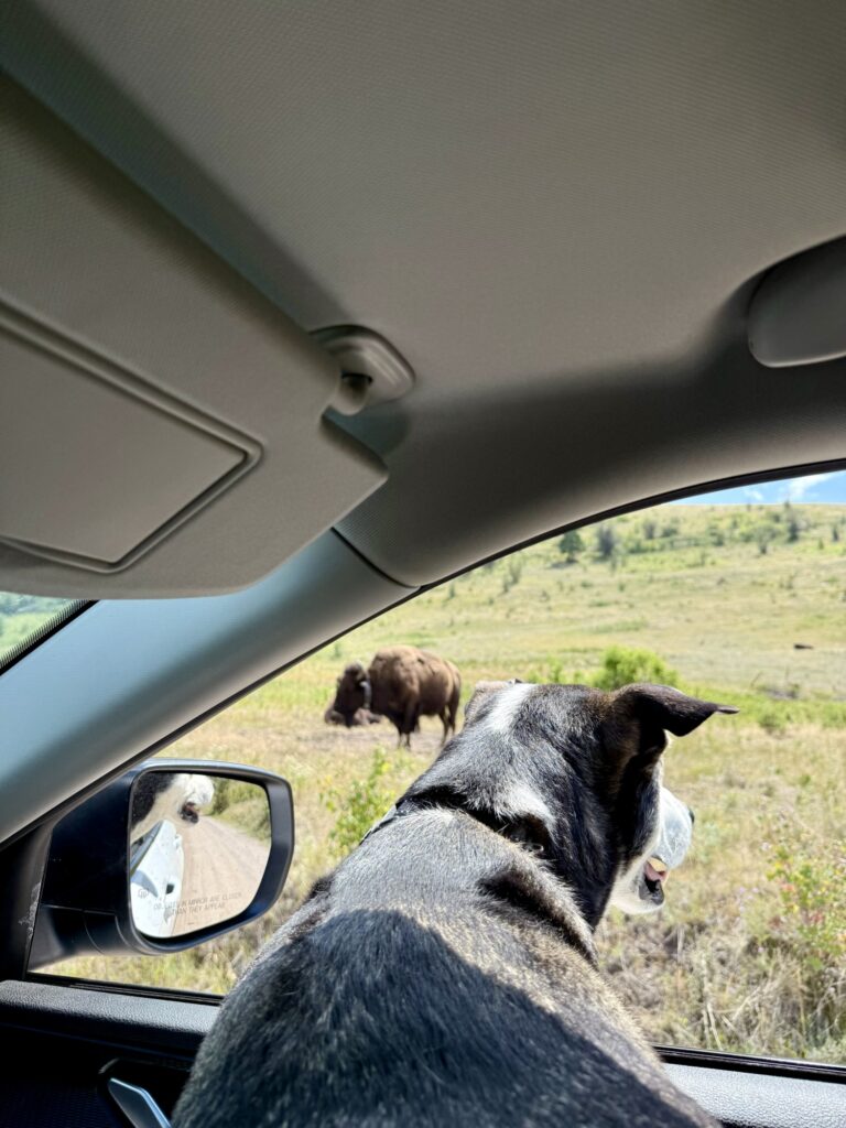 It costs $20 to enter the CSKT Bison Range. Founded in 1908, the conservation is home to about 350 bison. Dogs are allowed at the visitor center and then in your car as you drive through the conservation. Max enjoyed sticking his head out the window and watching the bison lounging in the fields. There are also opportunities to see elk, deer, and antelope.